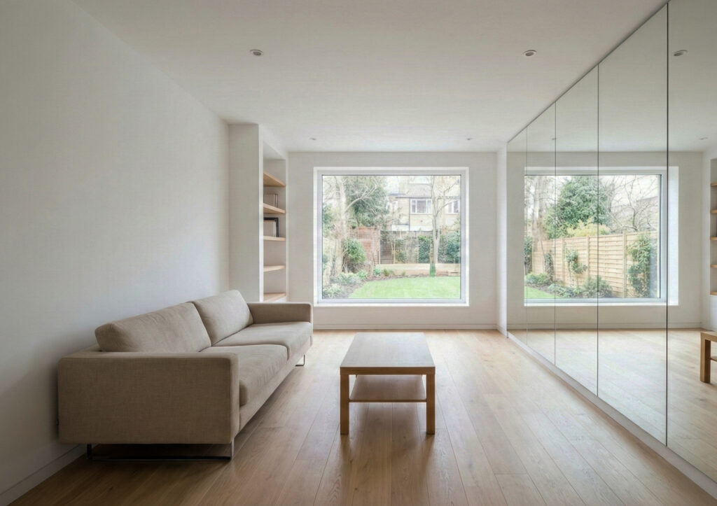 - 대형 거울의 마법: 거실 한쪽 벽이나 복도 끝에 프레임이 얇은 대형 전신 거울을 둬보세요. 반대편 공간이 반사되면서 공간이 2배로 확장된 듯한 착각을 줍니다. 창문 반대편에 두면 빛을 반사해 집이 더 밝아지는 효과까지 얻을 수 있습니다.